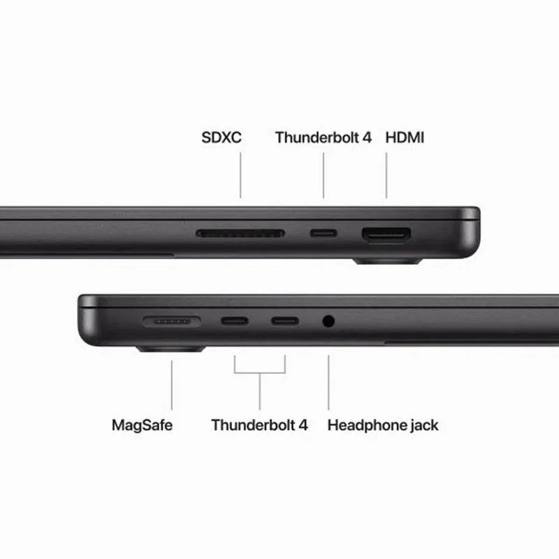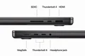 همه مدلهای مکبوک پرو ۱۴ و ۱۶ اینچی شامل یک اسلات کارت UHS-II SDXC، یک پورت HDMI 2.1 است که از نمایشگر ۴K تا ۲۴۰ هرتز یا نمایشگر ۸K تا ۶۰ هرتز و جک هدفون ۳.۵ میلیمتری پشتیبانی میکند.
